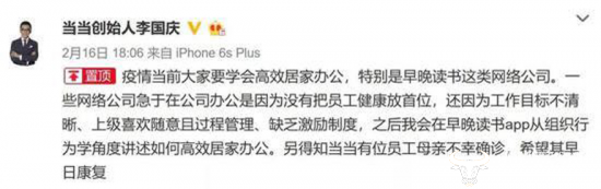 值得注意的是,尚未与当当网创始人俞渝解除婚姻关系的李国庆也有发声:一些网络公司急于在公司办公是因为没有把员工健康放首位,还因为工作目标不清晰、上级喜欢随意且过程管理,缺乏激励制度。