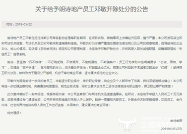 据悉,5月22日,朗诗集团官方发布一则“反腐败公告”。
