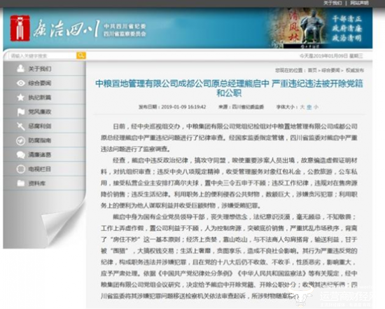 去年1月,四川省纪委监委发布消息称,中粮置地管理有限公司成都公司原总经理熊启中因严重违纪违法被开除党籍和公职。
