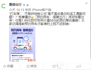 但是,2月20日,曹操出行的官方微博却发布一条内容及很长的配图,称“仅需1.99元即可购买价值50元的预约单优惠券!大家记得提前预约用车才能准时上班不迟到”。