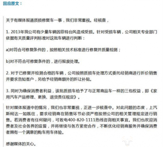 据了解,上汽大众斯柯达做出回应,并承认2013年有车辆因“菲特”台风造成受损,并对可修复的车辆进行修复并折价销售,同时要求经销商告知客户,批质损车将享受与正常商品车一样的三包权益。