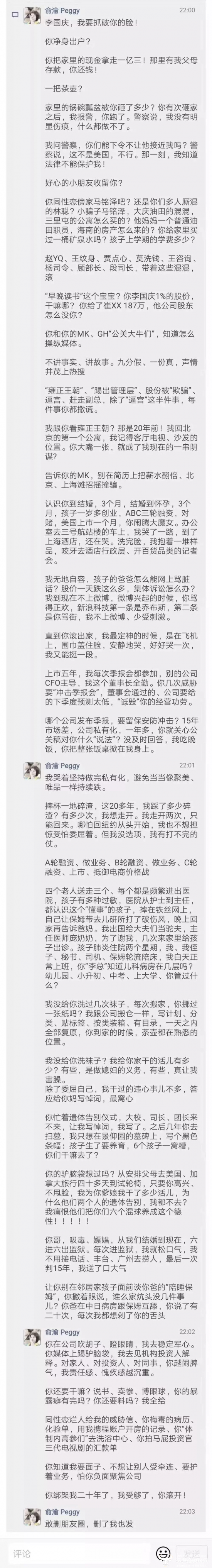 10月23日深夜,在北京当当网信息技术有限公司(当当网)原CEO、联合创始人李国庆微信朋友圈,一条10月19日发布的有关“回应摔杯事件,宣传自己创业项目”的文章下,李国庆的妻子、同为当当网联合创始人的俞渝罕见发布长文回应,称李国庆“不讲事实,讲故事。九分假,一分真,声情并茂上热搜”,“‘雍正王朝’、‘踢走管理层’、‘股份被欺骗’、逼宫、赶走副总……除了‘逼宫’这半件事,每件事你都撒谎。”