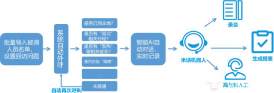 该机器人采用云+AI技术,12小时不见面快速部署,实现自动回访录音、自动生成报表,高危自动转接人工据坐席和保护人员隐私的功能,及时统计收集居民身体健康状况,并对数据进行分析总结,为疫情群防群控提供了了强有力的信息化支撑。