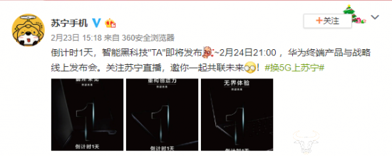 2月24日21时,华为新品“云发布会”将在苏宁直播举行,余承东等华为高层将亮相,为大家带来多款新品。从苏宁手机官方微博发布内容可以看到,此次华为新品发布会将推出全新的折叠屏手机Mate Xs以及新一代平板和笔记本电脑。