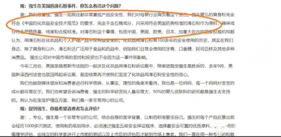 然而,强生(中国)有限公司总裁谢冰却振振有词,在接受媒体采访时强硬地说,“强生婴儿的爽身粉完全符合《中国的化妆品安全技术规范》的要求,完全不含石棉成分”。而2019年10月18日,强生自己都发布声明称,美国食品药品监管局(FDA)在一瓶强生婴儿用爽身粉内检测出含有石棉。谢冰,这是否涉嫌误导中国消费者?