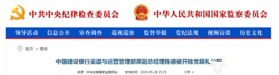 据了解,2019年5月,中央纪委国家监委驻中国建设银行纪检监察组、北京市纪委监委对中国建设银行渠道与运营管理部原副总经理陈德严重违纪违法问题进行了纪律审查和监察调查。