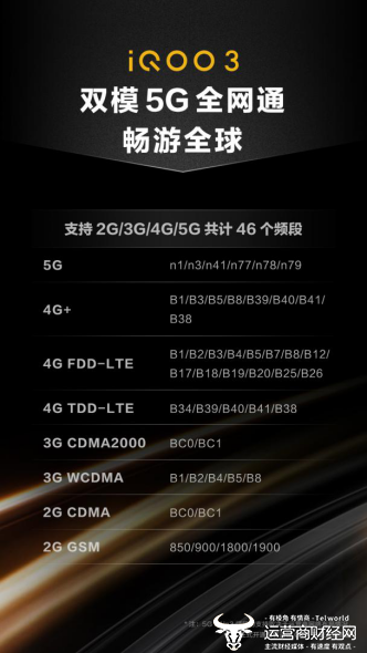 同时,iQOO 3可以支持6频全网通,包括n1/n3/n41/n77/n78/n79六个频段,实现广阔的网络覆盖,并且iQOO 3在天线设计上,采用侧边分布无线和多模态天线设计,以此为用户带来稳定畅快的网络体验。