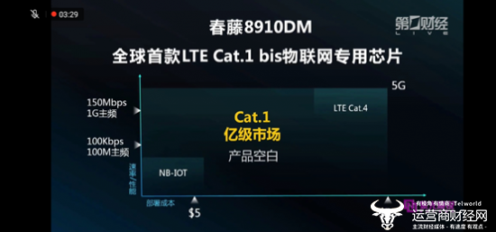 第二款产品是春藤8910DM,据楚庆介绍,这是全球首款LTE Cat.1 bis物联网芯片,具备四大优势,可带动物联网设备加速从2G/3G过渡到4G,填补了低功耗窄带物联网、传统宽带物联网之间的蜂窝通信方案空白。