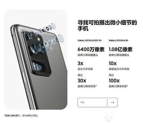 相机的改变则成了三星Galaxy S20系列最显著的升级点,Galaxy S20摄像头采用了1200万(超广角)+1200万(广角)+6400万(长焦)的多摄方案,支持3倍混合光学变焦和30倍的超高分辨率变焦,Galaxy S20+在此基础上增加了景深镜头;Galaxy S20 Ultra则采用了由1200万(超广角)+10800万(广角)+4800万(长焦)+景深镜头组成的多摄方案,支持10倍混合光学变焦和100倍的超高分辨率变焦。