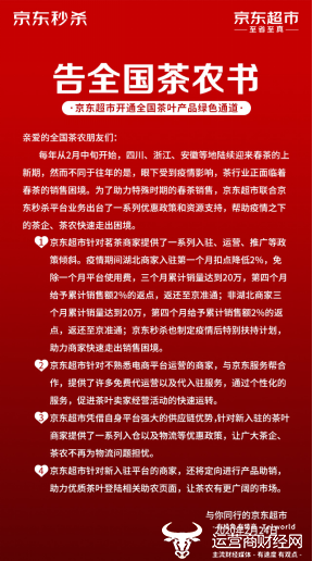 春茶季伊始,为帮助提升茶叶产品的用户曝光,使更多消费者第一时间感受春茶的鲜香,京东超市发起了“同心战疫 京助茶农”活动,通过入驻费减免、免费代运营、物流配送优惠、营销助力等多项服务,助力茶农快速赢得市场,迎接一个明媚的春天。