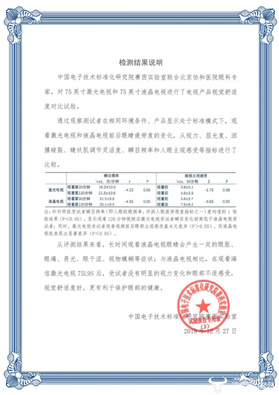 “通过对视力、屈光度、调节灵敏度、睫状肌灵敏度、瞬目等几个指标的对比分析,在观看激光电视后,没有明显的视力变化、没有眼部不适感,舒适度更好。”刘小伟在评测后说。
