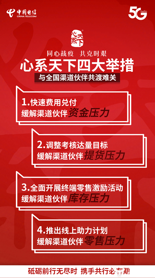 “心系天下”作为中国电信专属定制的手机品牌,在这次的疫情中也积极参与到这次的防控抗“疫”当中。渠道商是“心系天下”手机最紧密的合作伙伴,12年来心系天下深耕渠道、赋能渠道、助力打造标杆零售门店,实现与渠道伙伴的合作共赢。结合当前的疫情发展,“心系天下”积极响应,实施四大举措助力渠道伙伴复工复产。一是快速费用兑付,缓解渠道伙伴的资金压力。心系天下将加快启动2019年未兑付的激励费用,缓解渠道伙伴因疫情所带来的短期资金压力。二是调整考核达量目标,缓解渠道伙伴提货压力。针对疫情期以及疫情逐步恢复期,心系天下将相应调整考核目标,及销售达量阶梯,考核导向从提货向零售转变和疏导,消除渠道伙伴提货方面的后顾之忧。三是全面开展终端零售激励活动,缓解渠道伙伴库存压力。在全渠道开展心系天下产品终端激励活动,提升末端的销售积极性,促进渠道库存消化,助力渠道商资金快速回流。四是推出线上助力计划,缓解渠道伙伴零售压力。疫情期间,心系天下官方商城将服务各省客商,统一搭建线上销售平台,助力线下门店发货,促进用户销售转化。
