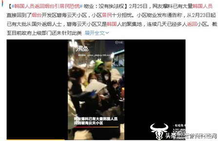 根据网上流传的视频可知,有大量韩国人员直接回到了烟台开发区碧海云天小区,且多数是晚上带着父母和孩子回来,把小区内的好多居民吓坏了。对此,小区物业发布通告称,从2月23日起已有大批从国外返烟人士,但物业没有执法权。