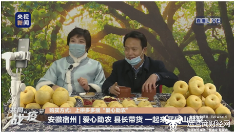 经全国妇联旗舰网站中国妇女网牵线,新电商平台拼多多与央视新闻联合搭台,砀山县政府与安徽鲜果时光商贸有限公司(全国妇女十二大代表、“铁娘子”武妍彦所属企业)、当地农户联合进行直播助农活动,让待销的砀山酥梨直通拼多多平台5亿消费者。除县长之外,砀山县副县长陈新启也来到助农直播间,助力酥梨销售。