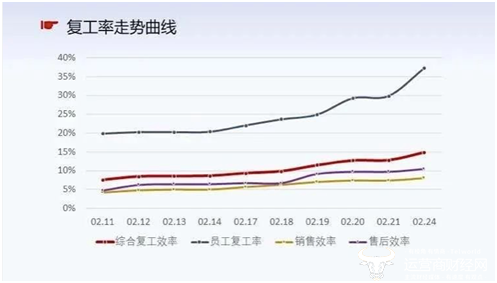 汽车行业复工比例也在逐步回升,中国汽车流通协会最新调研结果显示,在接受调研的74家汽车经销商集团4702家4S店中,2月24日员工复工率为37.2%。复工近一周时间内,汽车经销商的综合复工效率、员工复工率、销售效率、售后效率等指数整体均呈上扬趋势。