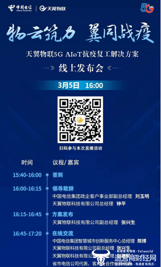 近日,运营商财经网获悉,中国电信天翼物联公司将以“物云筑力 翼同战疫”为主题召开年后首场发布会,会上将发布七大场景的5G AIoT解决方案,助力企业抗疫复工。