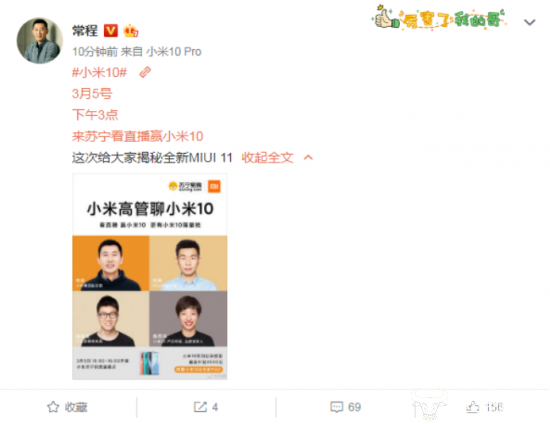 3月4日,小米副总裁常程微博表示,3月5日下午3点将在苏宁直播和大家一起聊聊小米10,给大家揭秘全新MIUI 11,一同参与直播的还有小米新媒体总监陆柒柒、小米CC产品经理及品牌发言人魏思琪和MIUI产品总监刘鸣。
