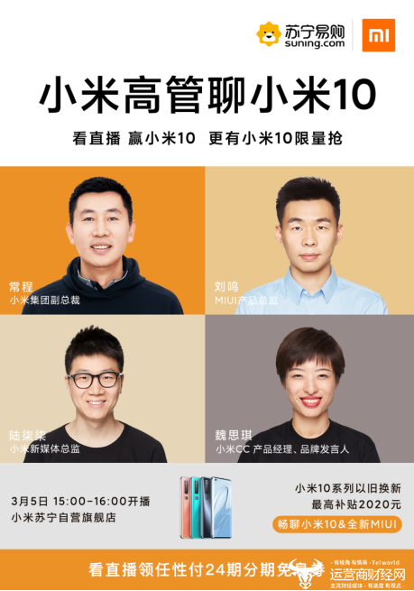 据悉,苏宁目前持续发力全民营销,此次小米常程在苏宁直播带货,将限时开抢稀缺爆款小米10新机,同时还有任性付24期免息券和12期免息券,以及以旧换新最高补贴2020元,并且还将直播抽送一台小米10新机送给观众,对米粉来说,非常诱人。
