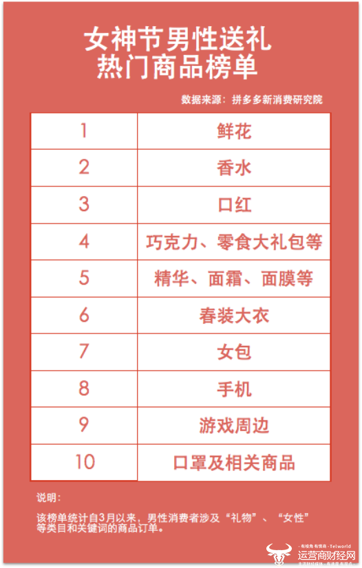 3月8日,新电商平台拼多多发布了《女神节男性送礼热门商品榜单》。该榜单对3月以来,男性消费者涉及“礼物”“女性”等相关关键词商品订单进行统计,最终“鲜花”“香水”“口红”再度上榜,成为男性送礼“老三样”。