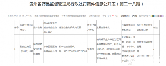 据悉,去年年底,贵州省药品监督管理局官网公布了相关行政处罚决定书。内容显示,毕节百原医药分别于2018年8月12日和14日购进安神补脑胶囊400盒与200盒,2019年6月28日,生产单位桑海制药向毕节百原医药送交召回通知书,召回了236盒。7月1日,贵州省药品监督管理局向毕节百原医药送达不合格报告书,该公司于15日前召回16盒。