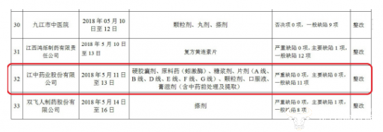 2019年7月5日,江西省药品监督管理局发布《药品生产监督检查及处理情况通报》,有99家企业存在生产缺陷。其中,就有江中药业,涉及硬胶囊剂、原料药(蚓激酶)、糖浆剂、片剂(A线、B线、D线、E线、F线、G线)、颗粒剂、口服液、膏滋剂,检查结果显示存在11项一般缺陷,不存在严重缺陷和主要缺陷。