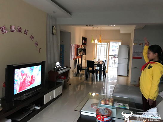 成都市锦江区娇子小学六年级学生吴小小在家中通过电信IPTV收看四川云教电视课堂