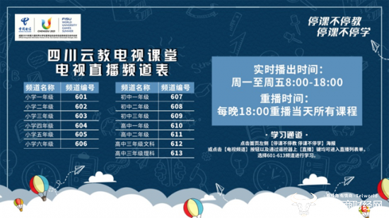 目前,中国电信四川公司IPTV教育频道“停课不停教 停课不停学”专区课程安排第一周课表已经发布,后续将提前一天下发次日课表,引导广大学生收看直播和点播。届时,将通过四川电信公众号、微信微博、网厅、掌厅等电子渠道,10000号客服座席,以及省教育厅官微“四川教育发布”发布公告。
