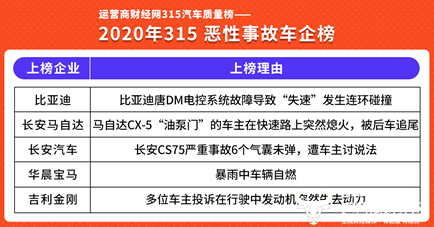 近日,运营商财经网整理了2019年出现重大恶性事故的汽车品牌,其中比亚迪唐DM因电控系统故障导致“失速”发生连环碰撞事件入选“2020年315恶性事故车企榜”。