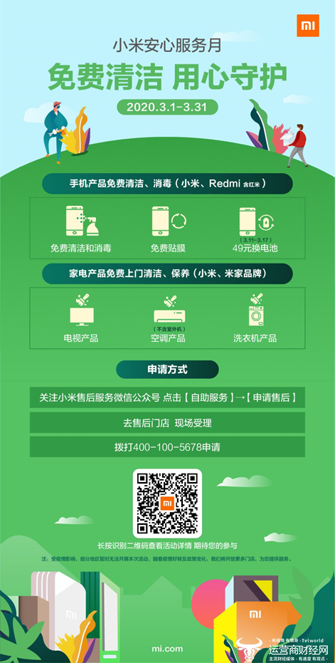 活动参与指南:小米手机用户可直接到售后门店,体验免费服务。另外,考虑到疫情管控严格或当地没有售后服务门店的地区,此次活动,小米整期支持寄修服务。用户可关注小米售后服务公众号-自助服务-售后申请【申请寄修】,或登录小米官网,操作“售后申请”【申请寄修】;也可拨打400 100 5678服务热线【申请寄修】。家电用户也可在小米商城APP或小米售后微信公众号,操作“自助服务”-“售后申请”,问题填写“清洁保养”即可,或拨打400 100 5678预约服务。