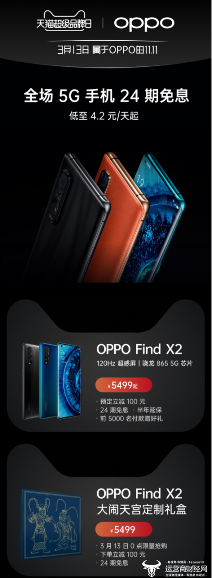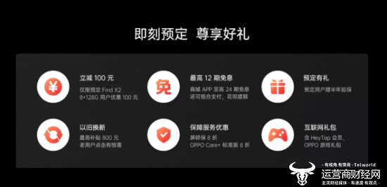 在OPPO商城、天猫旗舰店、京东和苏宁易购预定OPPO Find X2系列手机,享受定金立减100元优惠、最高24期免息分期以及半年延保服务的福利政策。消费者最低日付7.4元,便可得到一款集顶级性能、屏幕、影像实力于一体的5G全能旗舰。
