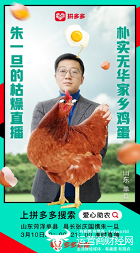 3月10日,朱一旦和山东菏泽单县县长张庆国现身拼多多助农主播间,一同向拼多多平台消费者介绍鲜鸡蛋,帮助农户走出销售受阻的困境。央视新闻也对此次助农行动进行了全程直播。