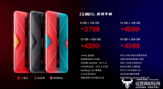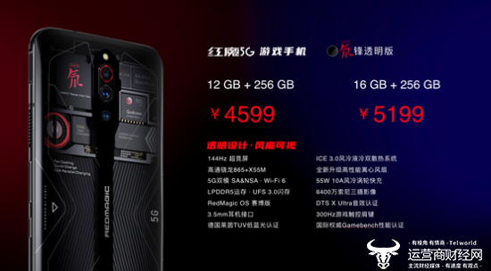 售价和配置方面,红魔5G非常丰富,还有全球首款量产16GB大运存。关键是所有配置方面都是全系标配,绝不缩水,比较厚道。努比亚红魔5G游戏手机的骇客黑、火星红、赛博霓虹版本8GB+128GB配置售价仅3799元, 12GB+128GB配置售价仅4399 元, 12GB+256GB高配售价4399 元,16GB+256GB顶配售价4999 元! 氘锋透明版,,可看到风扇转动,12GB+256GB高配售价4599 元,16GB+256GB顶配售价5199 元!各版本之间相差的只是颜色和容量,诚意十足。目前这款全新电竞游戏旗舰将于3月12日晚在努比亚官网、努比亚京东旗舰店、中国联通同步开启预售,于3月19日10点在以上渠道开启首销。