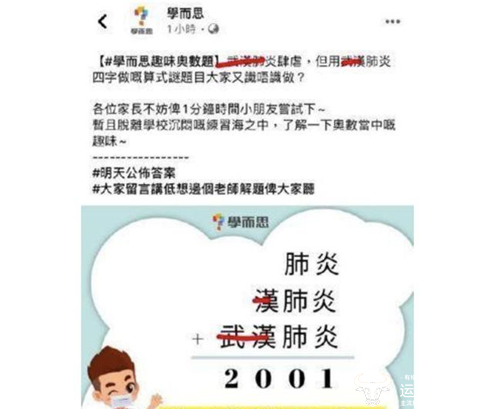 此外,2020年3月3日中午,学而思香港分校一员工在脸书发布一则有关新冠肺炎的数学题目,“肺炎+汉肺炎+武汉肺炎=2001,问:武x汉x肺x炎=?”。由于题目中未规范引用病毒名称,且表达很不严肃,此事迅速引起关注。