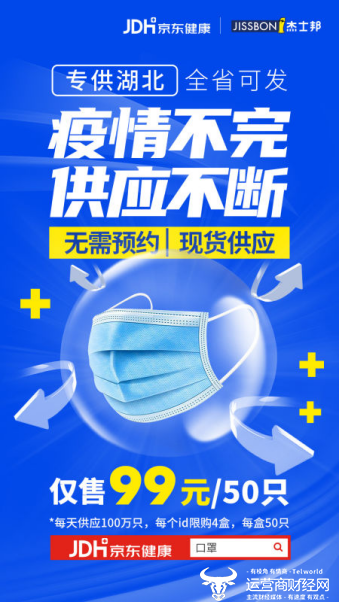 3月12日,京东健康联合人福医药集团股份公司,宣布每日提供100万只现货口罩专供湖北地区,直至疫情结束。