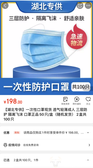 据了解,这批口罩将于即日起正式在京东APP开售,每个用户限购200只共4盒,每只售价低至1.98元,每个ID仅限购一次。收件地址为湖北地区的用户无需预约,通过京东APP搜索“口罩”--"点击查看更多医疗器械",就可直达购买页面下单,湖北省内全境所有县市均可送达。