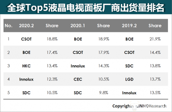 以出货量计,2020年2月中国大陆面板厂商已占到总出货量的59.4%,接近6成。TCL华星光电(CSOT)以18.8%的份额首次成为全球第一大液晶电视面板供应商;