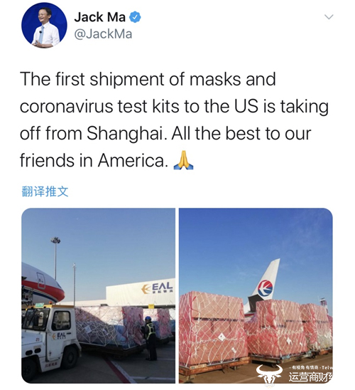 阿里巴巴创始人马云也于昨天在推特上开设了账号“Jack Ma”,并发布首条推文称,第一批运往美国的口罩和冠状病毒检测试剂盒已从上海起飞发运。