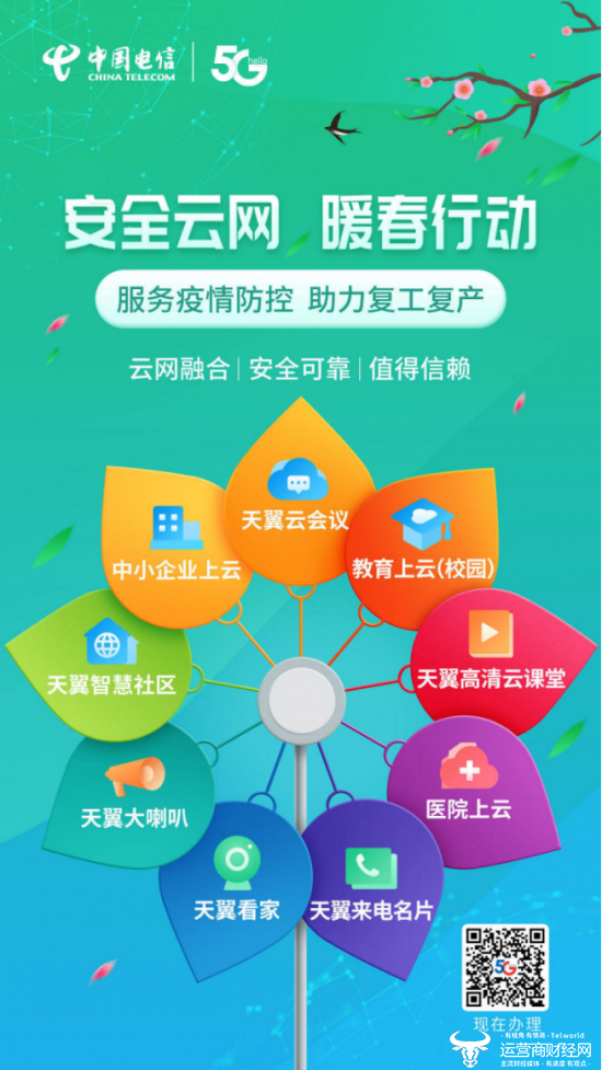 此外,中国电信积极助力复工复产,还推出包含来电名片、教育上云、天翼大喇叭、天翼高清云课堂、天翼看家、天翼云会议、天翼智慧社区、医院上云、中小企业上云等九大暖春行动,为更好的服务疫情防控,助牢抗疫大后方提供了坚实保障。