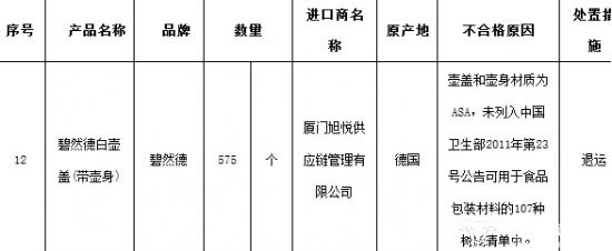 2017年,国家质检总局公布的进口工业产品不合格信息显示,一批次从德国进口的BRITA碧然德白壶盖(带壶身)检出质量问题被厦门口岸退运。而该产品不合格的原因主要是壶盖和壶身材质为ASA(Acrylonitrile Styrene acrylate copolymer),而该材质并未列入中国官方许可使用的食品包装材料清单中。