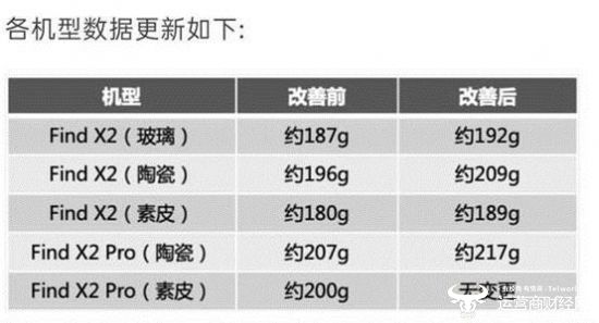 具体来说,Find X2手机的玻璃版重量从187克增加到了192克,增加了5克,Find X2陶瓷版从196克增加到了209克,增加了13克,素皮版增加了9克。Find X2 Pro中,素皮版质量没变化,陶瓷版增加了10克,重量为217克。