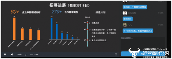 3月19日,中国电信“天翼智家线上发布暨生态合作招募启动会”线上直播正式开始,围绕e-Home体系、智家生态合作招募、IDH服务,智能组网e-OS等主题,中国电信天翼智家公司与阿里巴巴、百度等合作伙伴共同探讨智慧家庭生态圈产业赋能。目前超过4万人在线上关注。