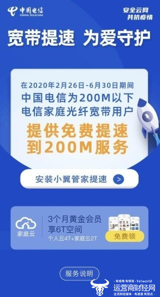 据悉,中国电信为满足广大群众疫情期间远程办公、在线教育等高速上网需求,才推出了为电信家庭光纤宽带用户免费提速到200M的重要服务举措。