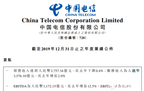 3月24日,中国电信发布2019年全年财报,公布中国电信总营收3757.34亿元,同比下降0.4%,净利润205.2亿元,同比下降3.3%。但可喜的是,截至2020年2月底,中国电信5G势头良好,5G套餐用户规模达1073万户。