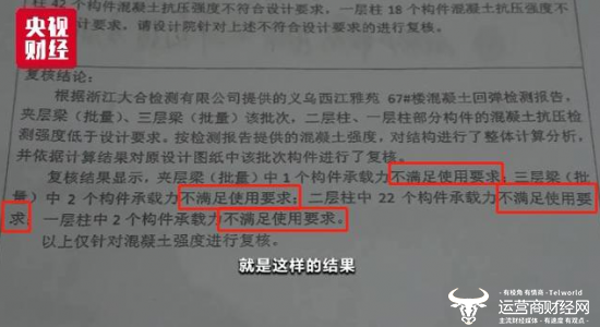 无独有偶,去年年底,据央视财经报道,浙江义乌的在建楼盘“西江雅苑”出现严重质量问题。有业主拍视频用手就可轻易扣掉梁柱上的水泥,且多幢房屋的不同楼层存在“梁柱轻轻一抠,混凝土就会掉落”“天花板、墙壁、露台、飘窗等处有不同程度开裂”等问题。