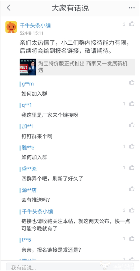 消息发布后,马上火遍“中国厂长”圈。据了解,在千牛头条上关注“淘宝特价版”上线的商家已超过10.3万人,留言超800条,不少商家纷纷表示,希望报名进驻淘宝特价版,第一时间争取到这个重要的发展机遇。