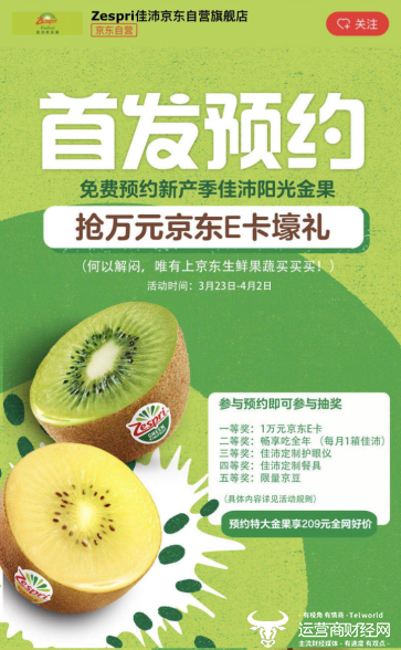 在京东拿下了佳沛新果季的首发权后,3月23日,新果季的佳沛奇异果在京东生鲜(京东APP)、7FRESH APP、七鲜超市、七鲜生活、七范儿全渠道首发预约,这也是生鲜产品首次尝试在电商平台推广预约模式。