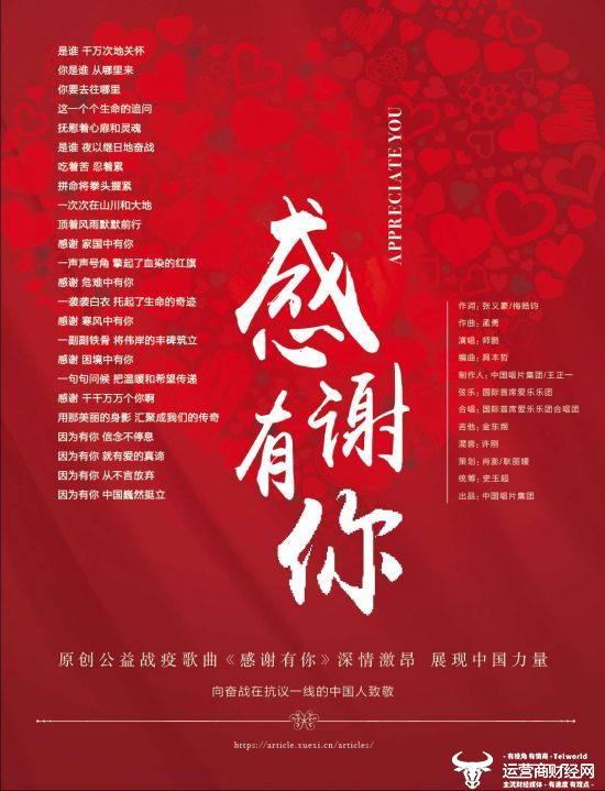 而这组诗诵歌的主创人员国资委新闻中心副主任张义豪多年工作在宣传战线,国资国企在此次战疫中发挥了举足轻重的作用,他对战疫一线国企人的奋斗奉献肯定感触很深。据了解,他从学生时期便十分热爱文学创作,写下众多诗歌。他的诗词文如其名,格局宏大、意境高远,叩人心扉,富有感染力和穿透力,这次受有关疫情防控工作重要讲话精神指引,以及轰轰烈烈的人民战“疫”中涌现的许多事迹感召,自觉操刀歌词文艺,积极为打赢这场战争贡献力量。梅皓钧是谷银基金高级顾问,国家高级人力资源管理师,曾创作《为了我们的中国亲人》、《天地同心》等公益歌曲。这次抗疫之战,诸多艺术家们受《感谢有你》诗词感染进行二度创作,竞相谱曲传唱,最终《感谢有你》形成了3词、1诵、5曲、6唱的传播状态,精彩纷呈,《最美是你》便是在《感谢有你》基础上进行重新写词编曲和演绎的成功之作。