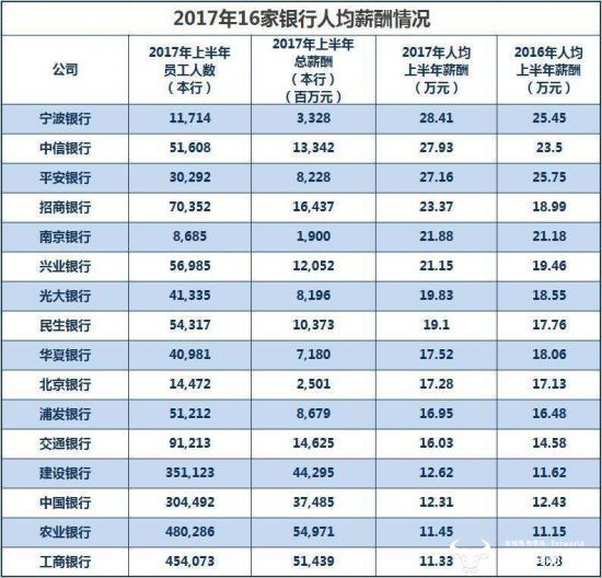 6家国有大银行的员工薪酬也不如股份制银行,招行、民生银行等股份制银行的平均员工薪酬为47.72万元,几乎是国有银行的2倍。而股份制银行中,排在榜前的3位的银行分别是招商银行,员工平均年薪57.68万元;浙商银行,员工平均年薪52.18万元;平安银行,员工平均年薪51.17万元。