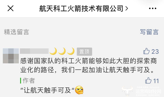 得知消息后,很多中国航天人激动不已,纷纷在负责火箭研发的航天科工火箭技术有限公司的账号下留言:“对商业航天来说,今晚有纪念意义”“感谢‘国家队’的科工火箭能够如此大胆地探索商业化路径,我们一起加油让航天触手可及”……