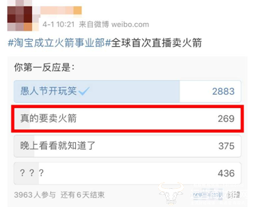 即使4月1日一早,航天科工火箭技术有限公司的专业人士曹梦现身,专门为大家详解了火箭的“选购指南”,但大多数人依然置之一笑。在一场近4000人参与的投票中,2883人认为:这是愚人节玩笑。